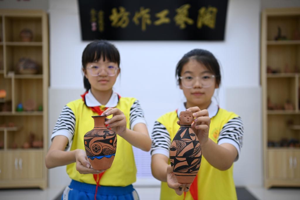 在临洮县第一实验小学,陶艺社团的学生展示自己绘制的彩陶作品。新华社记者 范培珅 摄