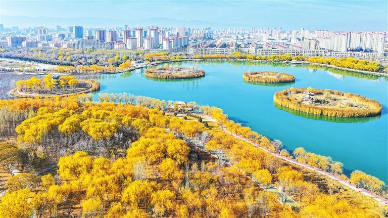 初冬时节,张掖市甘州区润泉湖公园碧水荡漾、层林尽染,与城市建筑相映成趣,构成一幅美丽的生态画卷。新甘肃·甘肃日报通讯员 杨潇