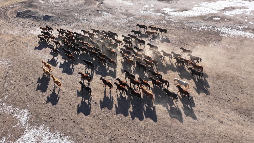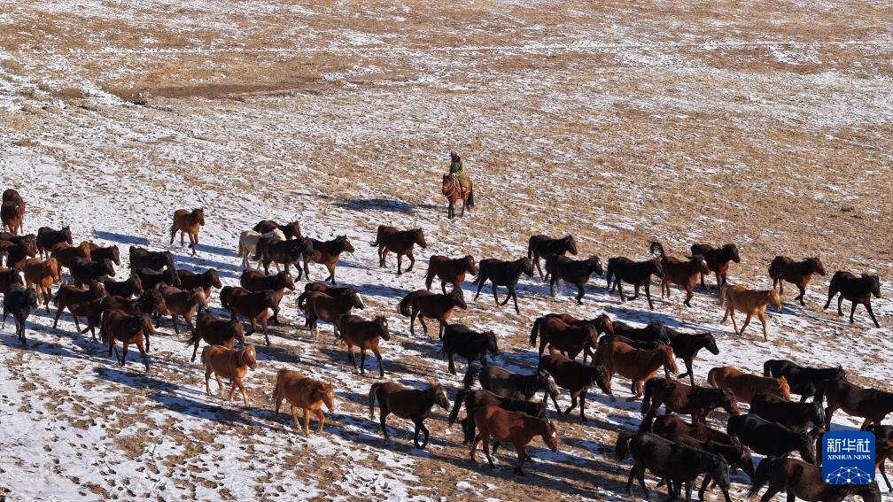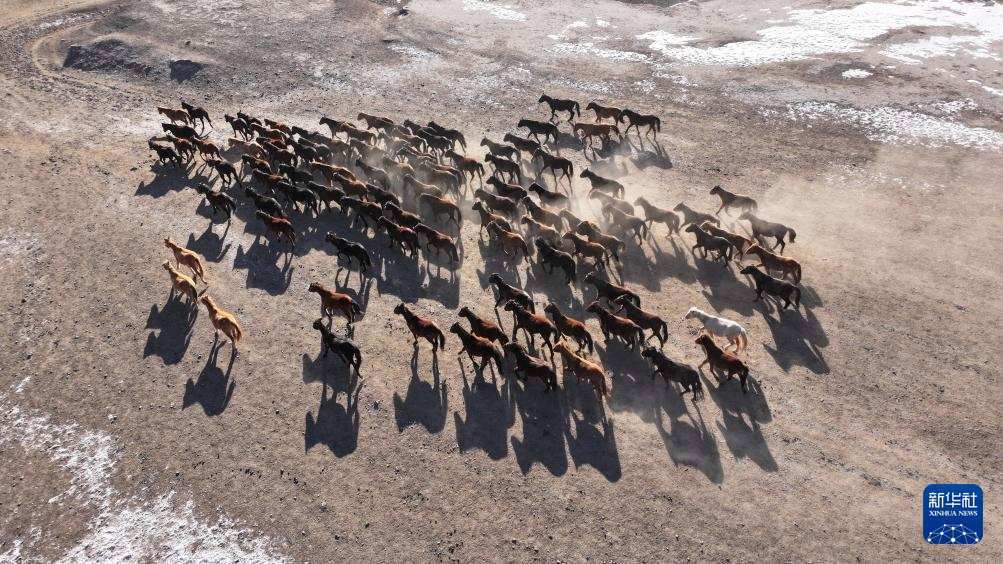 12月4日,在甘肃山丹马场一场,马群从天然草场转场至茬地(无人机照片)。新华社发(王超摄)