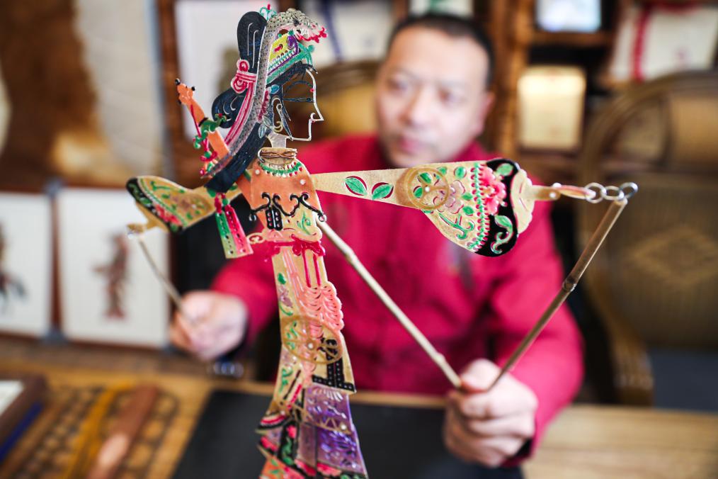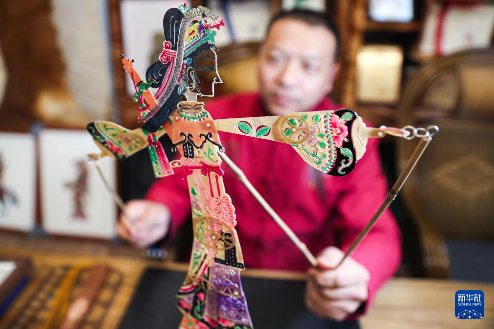 1月8日,在庆阳市环县环州故城皮影馆,环县道情皮影非遗传承人张治文检查白素贞影件的灵活度。新华社记者 郎兵兵 摄