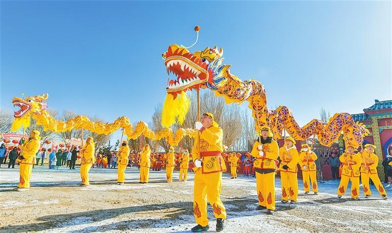近日,敦煌市阳关镇社火队在白马塔景区进行迎新春舞龙表演。新甘肃·甘肃日报通讯员 王斌银