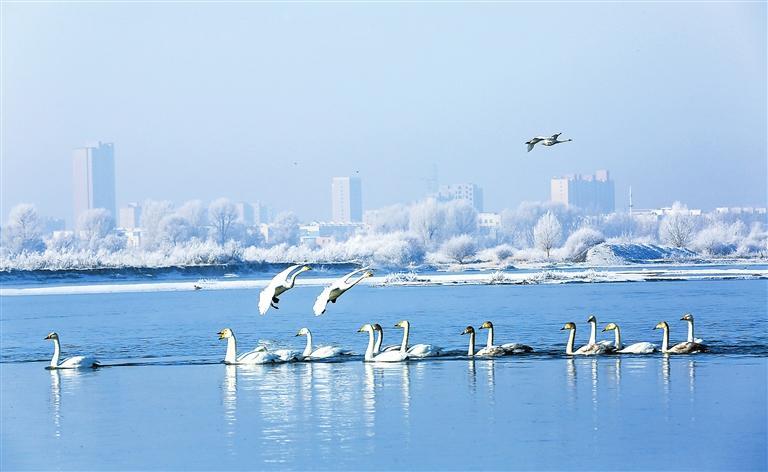 隆冬时节,高台县境内黑河岸边树木挂满霜花,几十只白天鹅在岸边栖息、翩翩起舞。 新甘肃·甘肃日报通讯员 陈礼