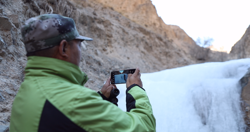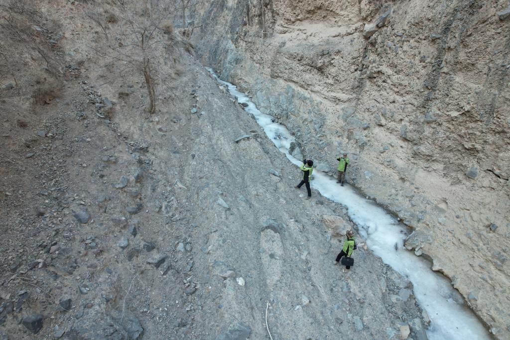 这是一条山洪开出的沟道,崎岖难行,两旁是陡峭的崖壁。石缝中的积雪和坚冰增加了攀爬的难度,我们小心地在大小石砾间寻找着合适的落脚点。然而,对于李洪虎和他的同事们来说,这不过是一条寻常的巡护路。