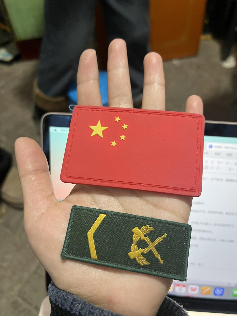 没想到,她竟然走向了每日随身的书包,找出笔袋,小心翼翼地打开一层又一层包裹整齐的纸巾:一个红旗配饰、一枚绿色肩章,跃然眼前。