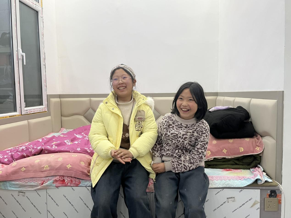 马瑞琳(右一)、马瑞兰(左一)坐在新家炕头。本报记者 张玉洁 摄