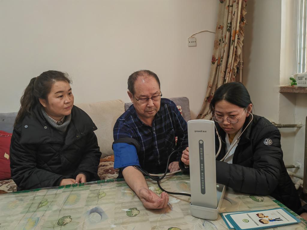 王丽娜(左一)正在和同事给范重阳(左二)测量血压。新华社记者 崔翰超 摄