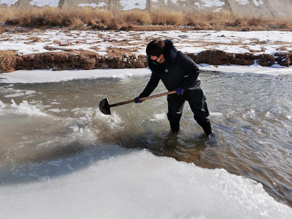 临洮水文站的工作人员在观测点人工破冰。(受访者供图)