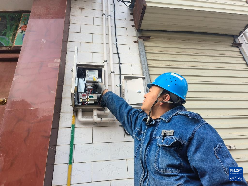 米祥仁供电所工作人员张伟在检查电表箱。新华社记者 王紫轩 摄