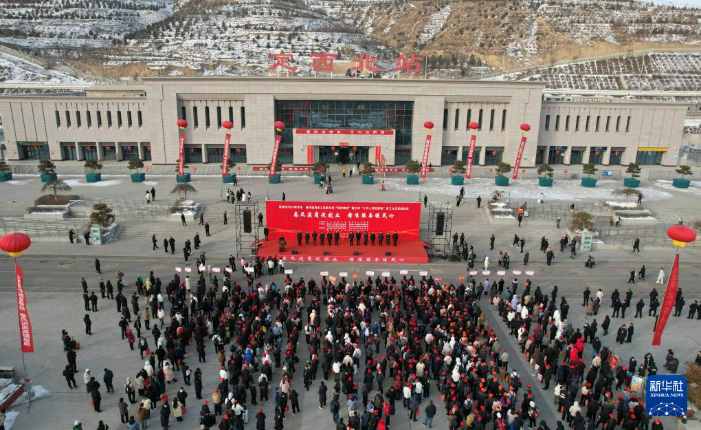 2月7日拍摄的甘肃省定西市返岗务工专列发车仪式现场(无人机照片)。新华社记者 张睿 摄