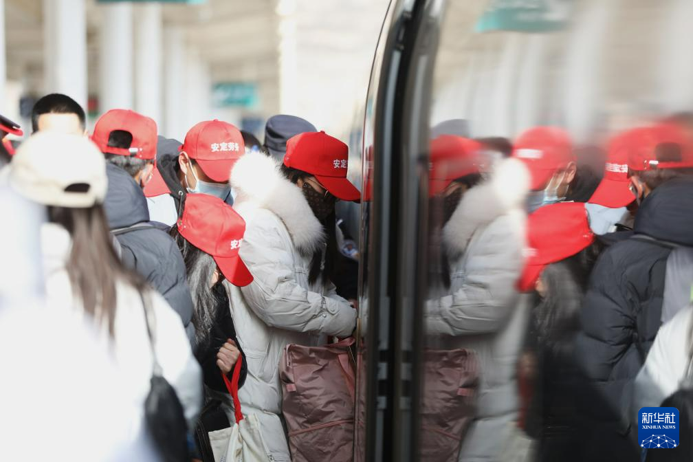 2月7日,甘肃省定西市外出务工人员登上专列。新华社记者 张睿 摄