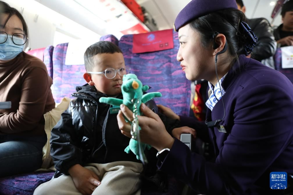 2月7日,兰州客运段高铁乘务人员为外出务工人员的孩子送上文创礼品。新华社记者 张睿 摄