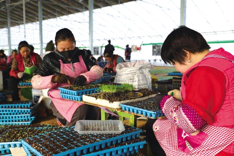 合作社工作人员正在分拣育好的蔬菜苗