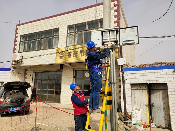 装设围栏、检查安全工器具、登梯……3月12日,在武威市古浪县海子滩镇红沙滩村的乡道边,国网武威供电公司海子滩供电所10千伏112冰草湾线路丁家山坡分支09+2号杆砖东砖宝城配变台区1号至5号计量箱电能表更换作业正在有序进行中。