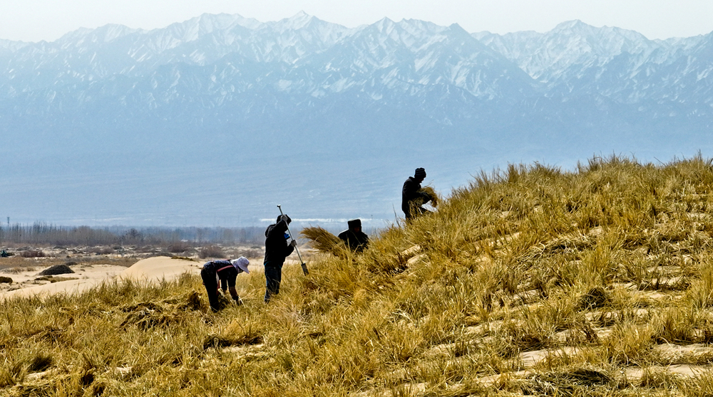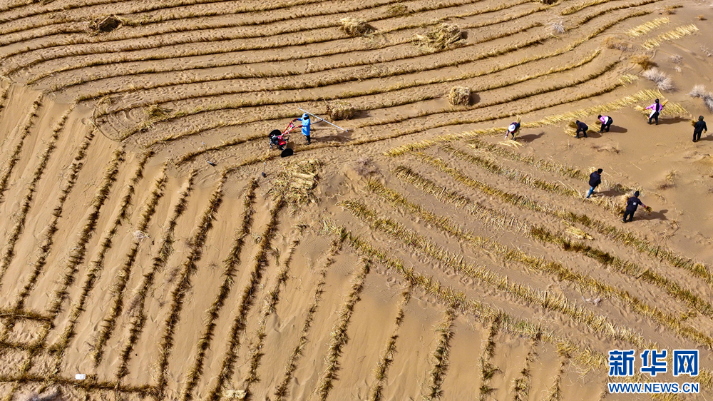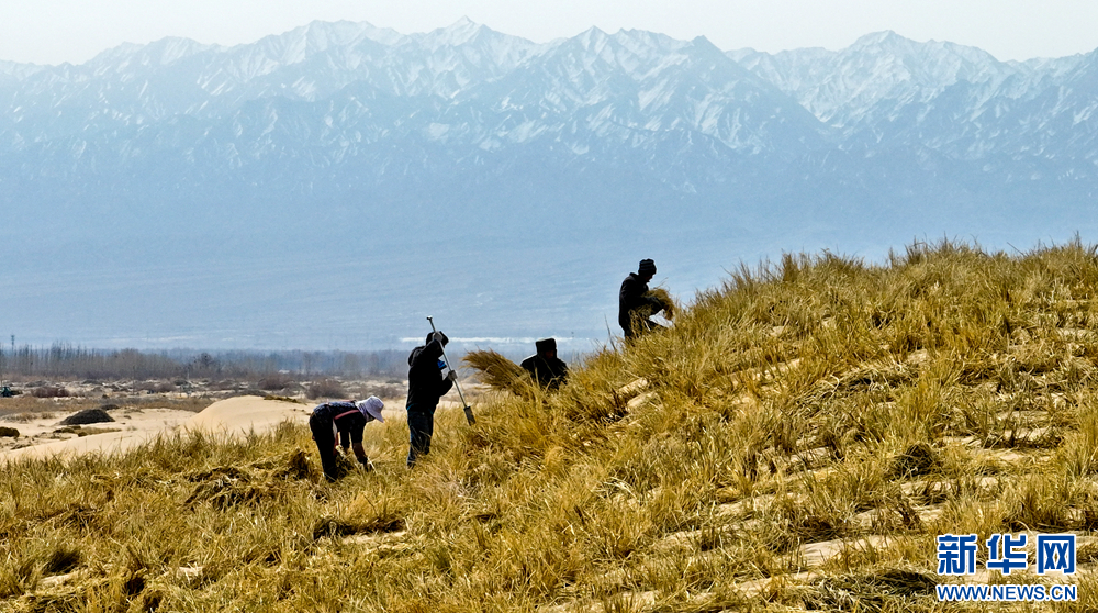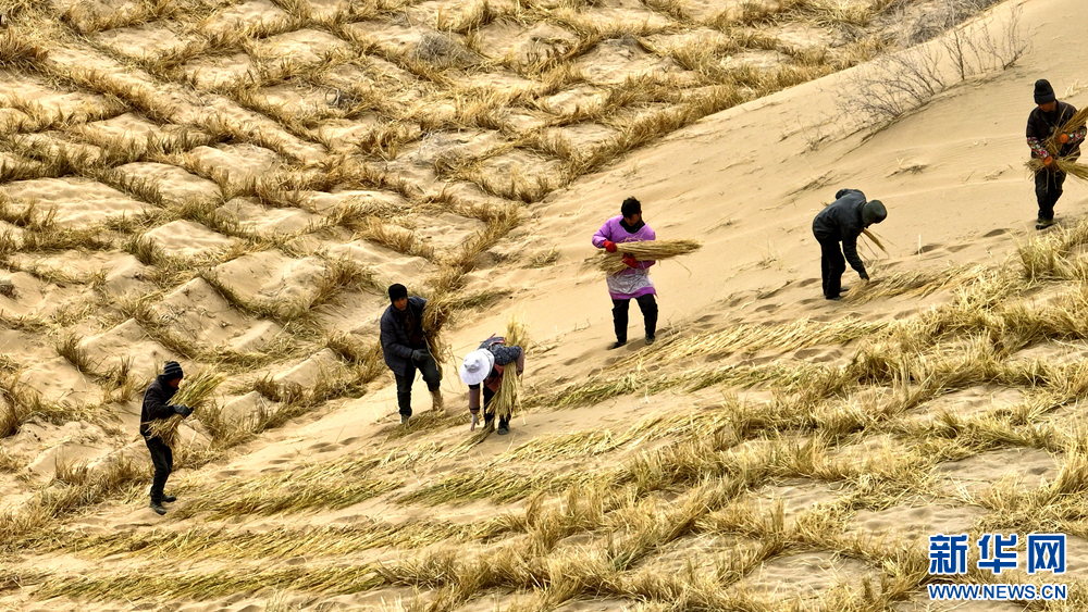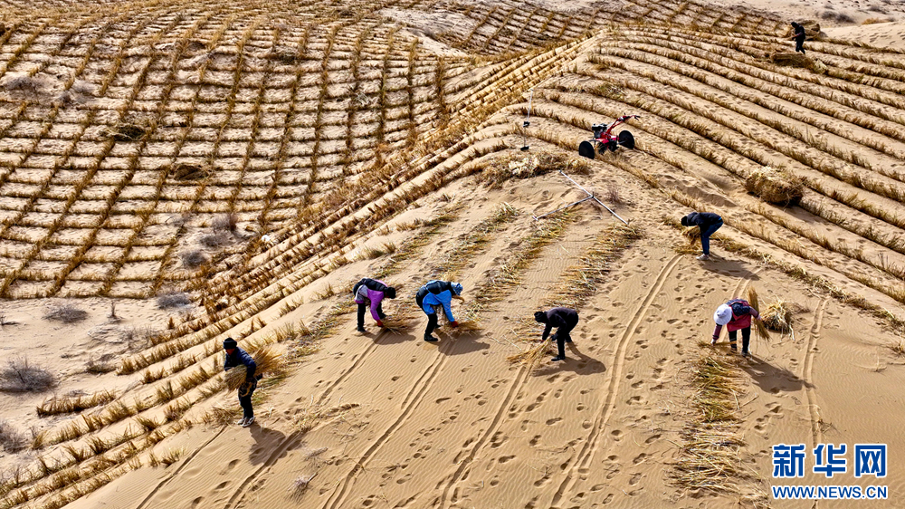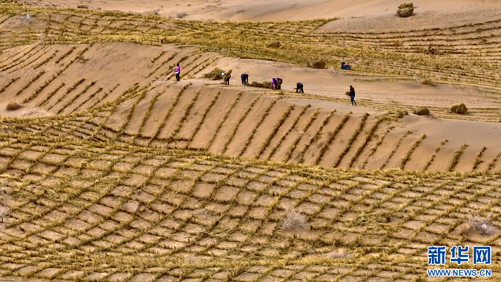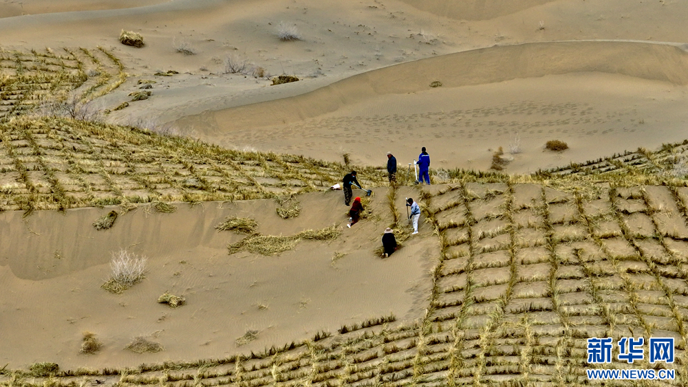 连日来,在甘肃省张掖市高台县黑泉镇西沙窝“三北”工程防沙治沙项目现场,工人们在沙丘上应用各种设备营建沙障和固沙林带,为沙漠系上“绿围脖”。高台县地处河西走廊中部,巴丹吉林沙漠南缘,是“三北”工程防沙治沙的重要地区。新华网发(王将 摄)