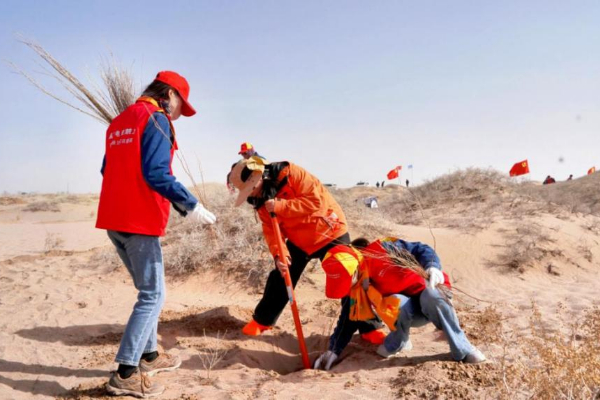 民勤县位于河西走廊东北部,东西北三面被巴丹吉林沙漠和腾格里沙漠包围,被列入国家“两屏三带”重点生态功能区的北方防沙带,生态地位举足轻重。近年来,国网武威供电公司积极响应政府“筑牢生态屏障,守护绿水青山”号召,多次组织职工前往植树基地开展公益植树造林活动,以电力红马甲护航沙漠绿洲建设,践行“绿水青山就是金山银山”的发展理念,书写“植此青绿,共筑绿色生态”的美好画卷。