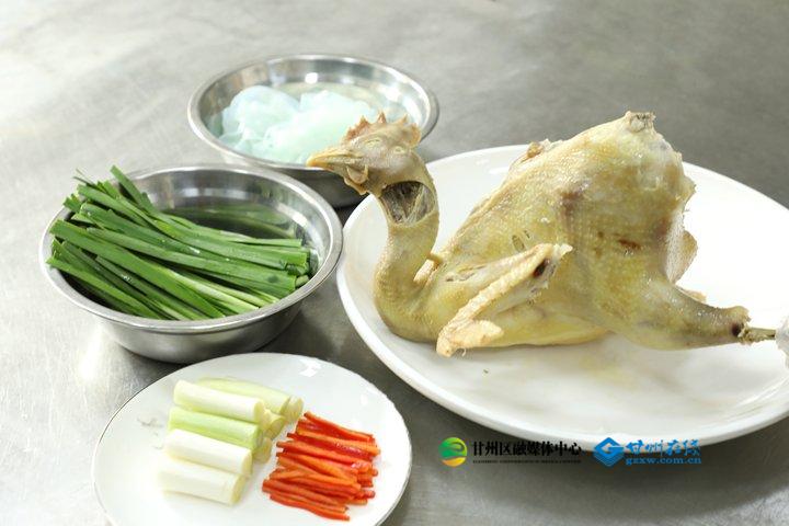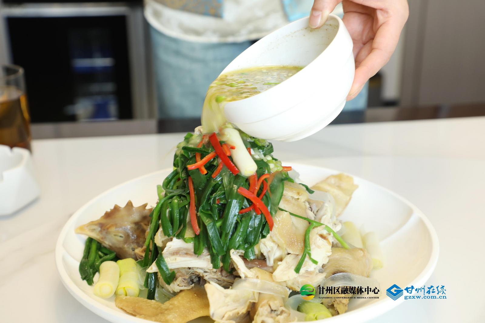 鸡肉煮好出锅后,切忌刀切,要顺着关节和纹理手撕分解,有嚼劲才是张掖人喜欢的口感。撕开的鸡肉形散而神不散,保持骨肉相连,使鸡肉充分吸收汤汁,吃时才能感觉味道浓郁。然后将锅内调料残渣打捞干净,留上适量的鸡汤,再加食盐、胡椒粉和少许花椒油、葱末勾兑出灵魂料汁,在盛满鸡肉的盘子里,加入提前煮熟的粉皮和切成长段焯过的韭菜,汤、菜、粉皮一起放在鸡肉上,一盘青绿相间的“美味景观”就呈现在眼前,色香味俱全的草芽鸡就上桌了。