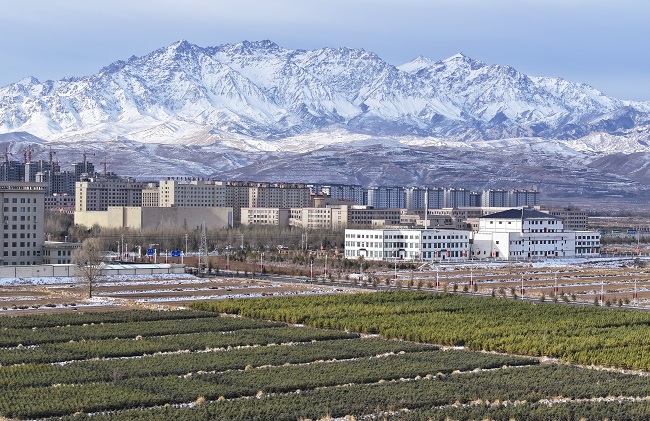 3月30日,在位于祁连山北麓的甘肃省张掖市民乐县,村落、城市、道路和雪山在晨曦的映衬下,与阡陌纵横的万亩良田,共同构成了一幅绝美的春日画卷。(王晓泾)