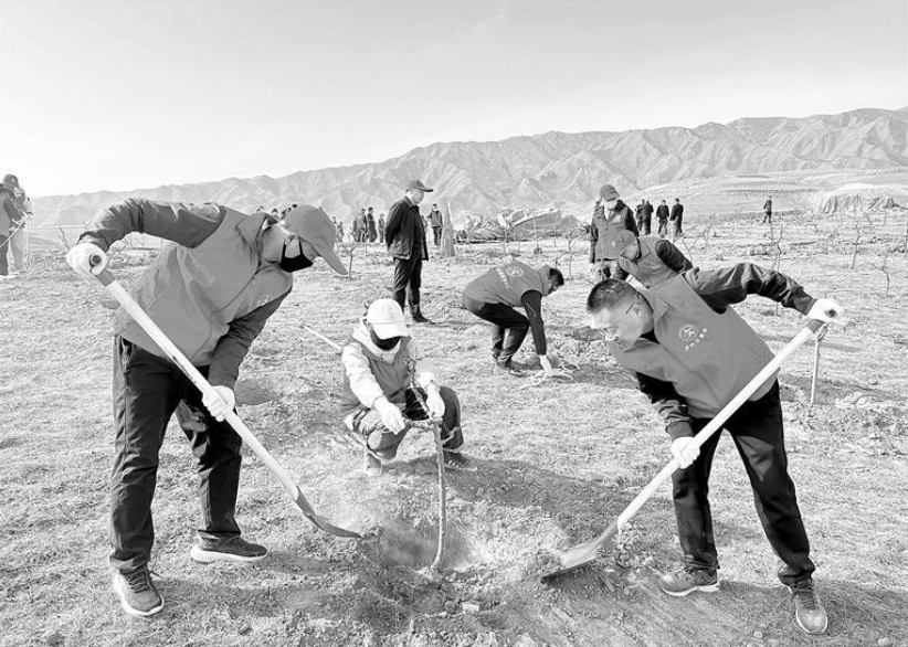 人间四月春,植树正当时。日前,武威市凉州区林草系统干部职工、志愿者在南部山区碳汇林建设基地开展义务植树活动,掀起春季造林绿化热潮。