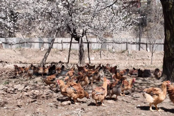 4月13日,记者来到塔山村村民韩得明家,映入眼帘的是成群的散养鸡在杏树间欢快觅食的场景,这些被俗称为“溜达鸡”的散养土鸡,或在草甸上追逐昆虫,或在树根处刨食草籽,偶尔扑棱翅膀跃上低矮枝丫,抖落的羽毛与飘零的杏花共舞,勾勒出一幅生态养殖的田园画卷。