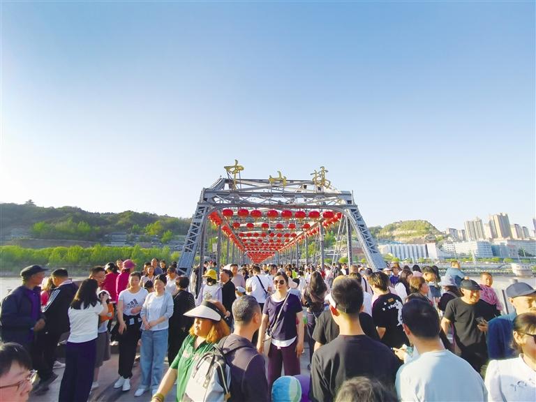兰州以火样热情和西北风情吸引天南海北游客纷至沓来,人们在烟火气和文化味之间寻找到这座城市的独特魅力。图为中山桥前游人如织。