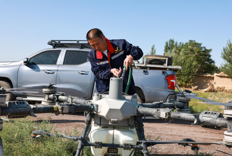 金塔县农业技术推广服务中心植保股股长闫锋说:“2025年小麦‘一喷三防’工作已经正式启动,今年采购了杀虫剂吡虫啉800公斤,磷酸二氢钾9.8吨,社会化服务3万亩,通过一次性喷施杀虫剂、叶面肥,达到促灌浆,保丰收的作用。”