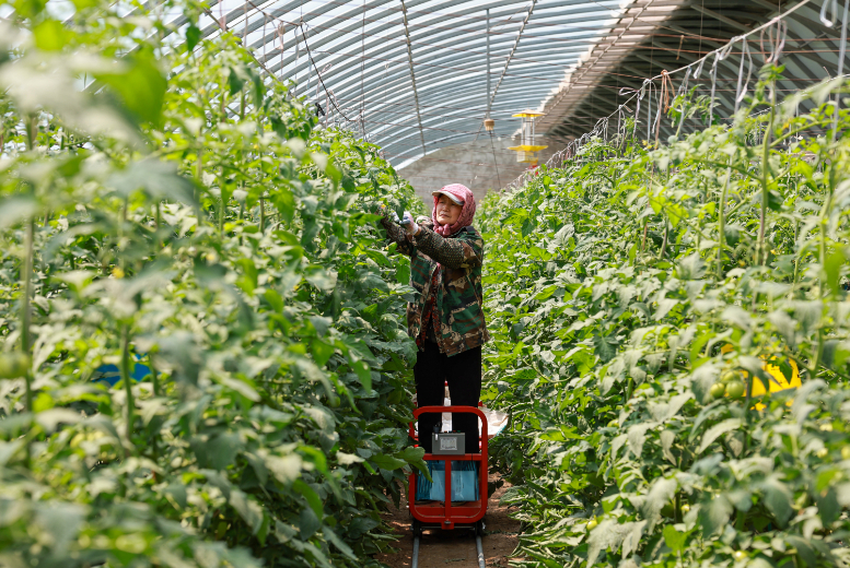 在县瓜菜集约化育苗及生态健康农业科技示范园内,一棚棚茄子、西红柿等蔬菜长势正旺、格外喜人,技术人员正通过手机,远程操控温室的卷帘、放风、喷灌等设施,工人们乘坐轨道运输车穿梭在大棚中,开展吊秧、整枝等工作,智能显示器上实时跳动着棚内空气温度、光照强度、土壤温度及盐碱度等各项数据。随着大棚自动化程度逐步提升完善,犹如一位“农业智能管家”,帮助技术人员根据数据变化,及时精准地调整种植策略。