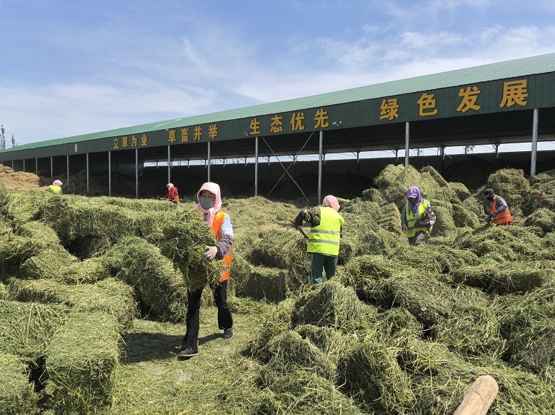 瓜州县草香香农业发展有限公司是河东镇一家经营牲畜饲养、饲料生产等业务的龙头企业,企业先后投资5000余万元,购置先进牧草机械收割设备,带动周边农户种植优质饲草,并为种植户提供分拣、粉碎、压缩、打包及销售等“一条龙”服务。