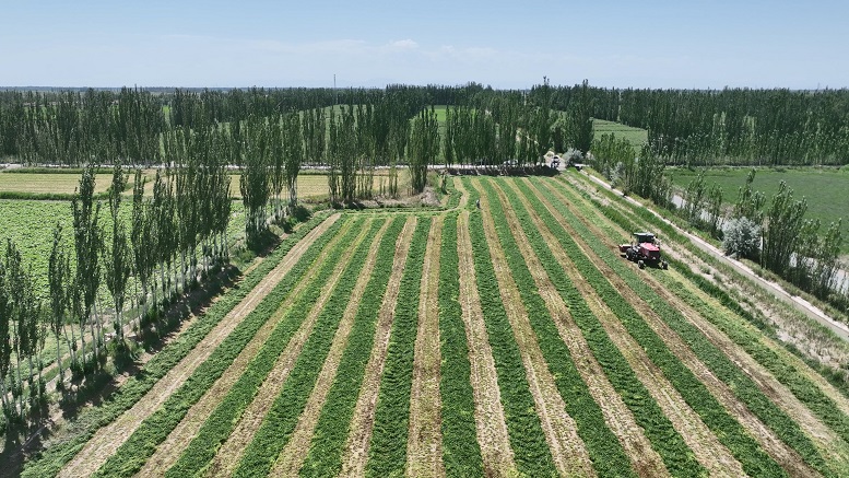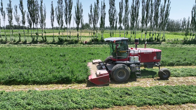 在瓜州县河东镇五道沟村村民谢新发的苜蓿地里,连片的苜蓿流青溢翠,收割机穿梭轰鸣,一丛丛嫩绿的苜蓿高效卷入机械,打包成整齐的草捆,即将被销往养殖场和周边县市,苜蓿产业成为农户眼中的“香饽饽”。