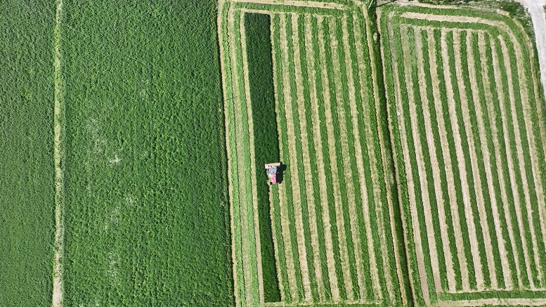 近日,瓜州县5.12万亩紫花苜蓿迎来头茬收割季。广袤的田野间,微风拂过,绿浪翻滚,往来穿梭的牧草收割专用机械和农户忙碌的身影,勾勒出一幅繁忙的丰收图景。
