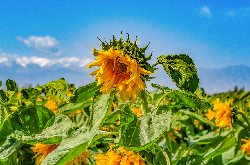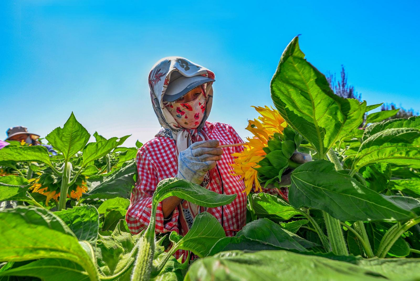 近日,嘉峪关市新城镇野麻湾村“千亩”制种向日葵迎来盛花期,朵朵花盘汇聚成金色花海,放眼望去,与雪山相融、与蓝天相接,如诗如画,美不胜收。