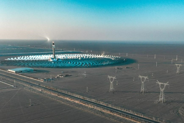位于酒泉瓜州境内的全国首个百兆瓦熔盐塔式光热电站和750千伏沙烟线、750千伏沙敦线。韩甜甜 摄