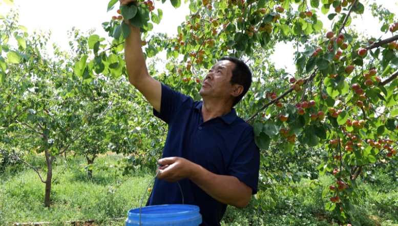 李兴辉和工人们娴熟地从枝头摘下一颗颗成熟的杏子装入手中的塑料桶,一辆载满杏子的三轮车驶向杏园门口。这里,前来收购杏子的客商将一桶桶杏子倒入筐中,经过整理打包后送往各大商超。