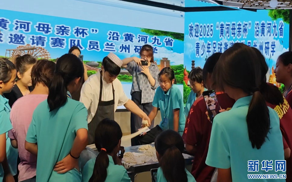 6日,参加2025“黄河母亲杯”沿黄河九省(区)青少年足球邀请赛的小球员们观看兰州拉面表演。新华网发(舒凡 摄)