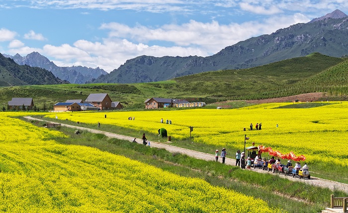 近日,扁都口油菜花进入盛花期,金黄花海与草原绿野相连,“碧云天、黄花地”的景致吸引了八方游客。人们徜徉其间,尽览北国风光的独特魅力。