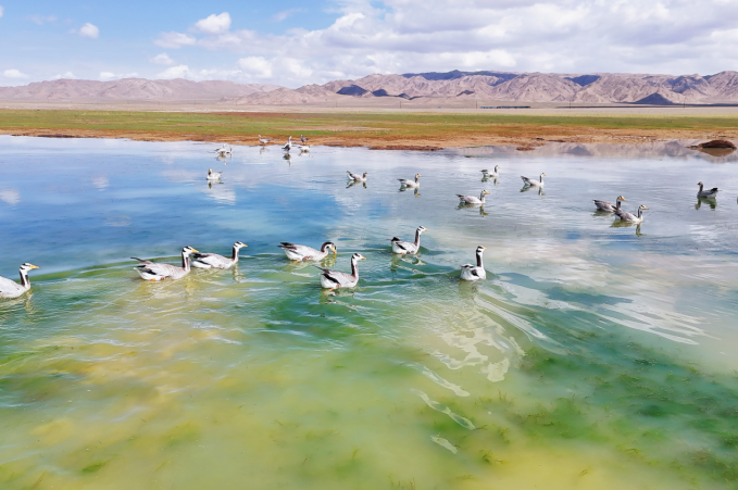 斑头雁在乌兰布勒格村戏水。