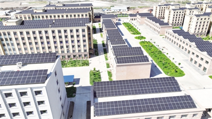 近日,在金塔县金塔工业集中区北河湾循环经济产业园集中生活区,一栋栋崭新的楼房整齐排列、错落有致。从空中俯瞰,排列有序的光伏发电板在阳光下熠熠生辉,为绿色发展注入新动能。