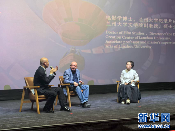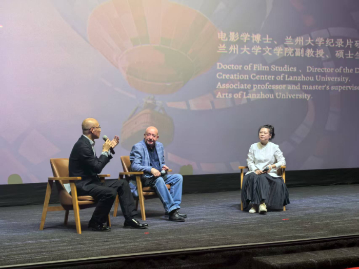 9月5日晚,启幕影片《卡鲁扎》映后交流会上,制片人谢尔盖·巴吉罗夫(中)与兰州大学纪录片研究与创作中心主任阮青(右)开展交流。