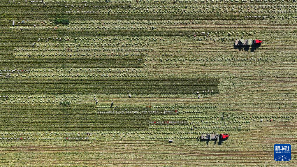 9月23日,菜农在甘肃山丹马场蔬菜基地里收获蔬菜(无人机照片)。新华社发(王超摄)
