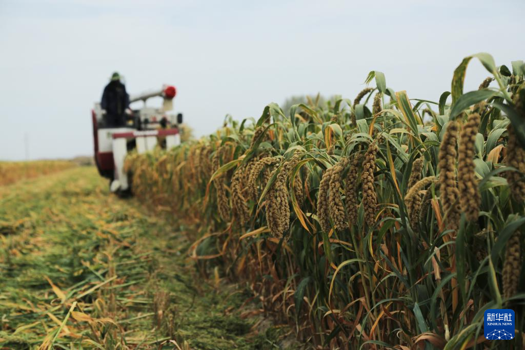 9月24日,收割机在甘肃省张掖市山丹县位奇镇暖泉村收割谷子。新华社发(陈礼摄)
