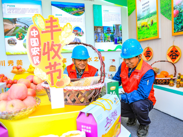 国网平凉供电公司员工走进特色农产品、中医康养特色产品和灵台苹果等主题展馆,现场开展巡视保电志愿服务活动,用心守护农民丰收路。马再励 摄
