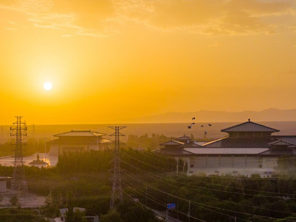 110千伏敦五一、二回线与敦煌会展中心文博会场馆在夕阳里交相辉映。