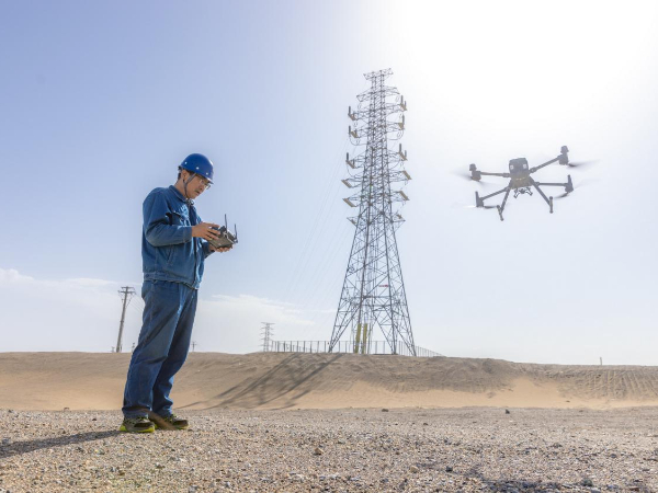 公司员工在35千伏机场线利用无人机巡视输电线路。