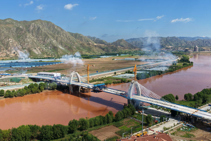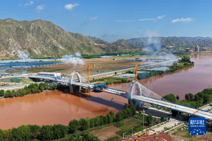 8月29日拍摄的兰州什川黄河大桥顺利完成中跨合龙(无人机照片)。(兰州市委宣传部供图)
