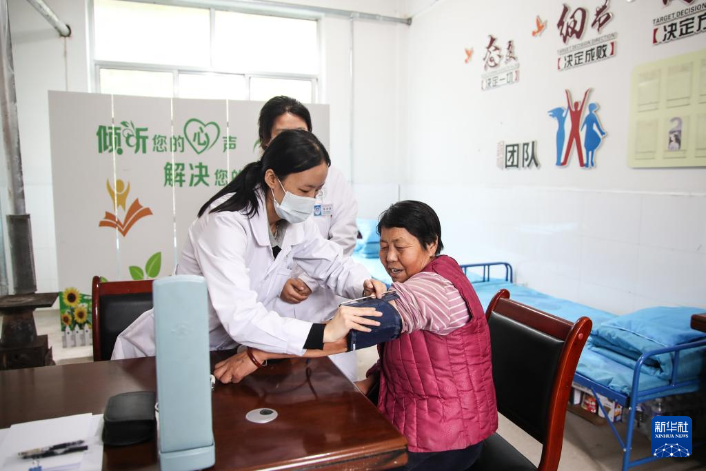 9月28日,在定西市漳县木林小学安置点医疗点,医护人员为受灾群众量血压。新华社记者 郎兵兵 摄
