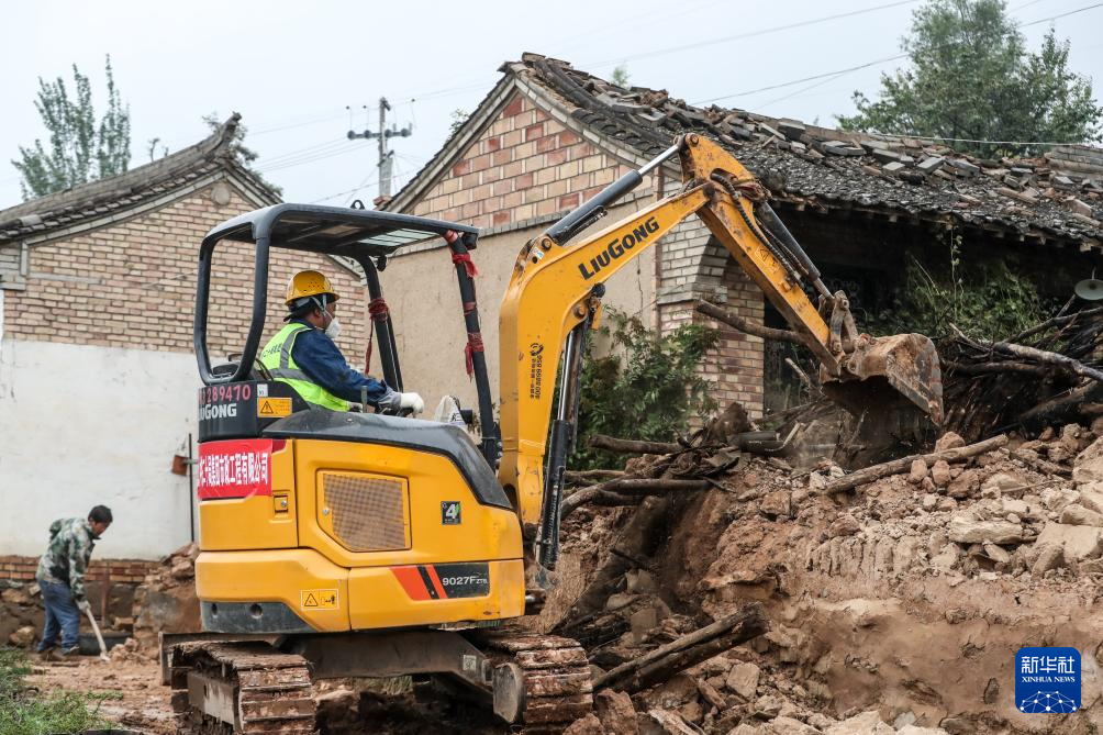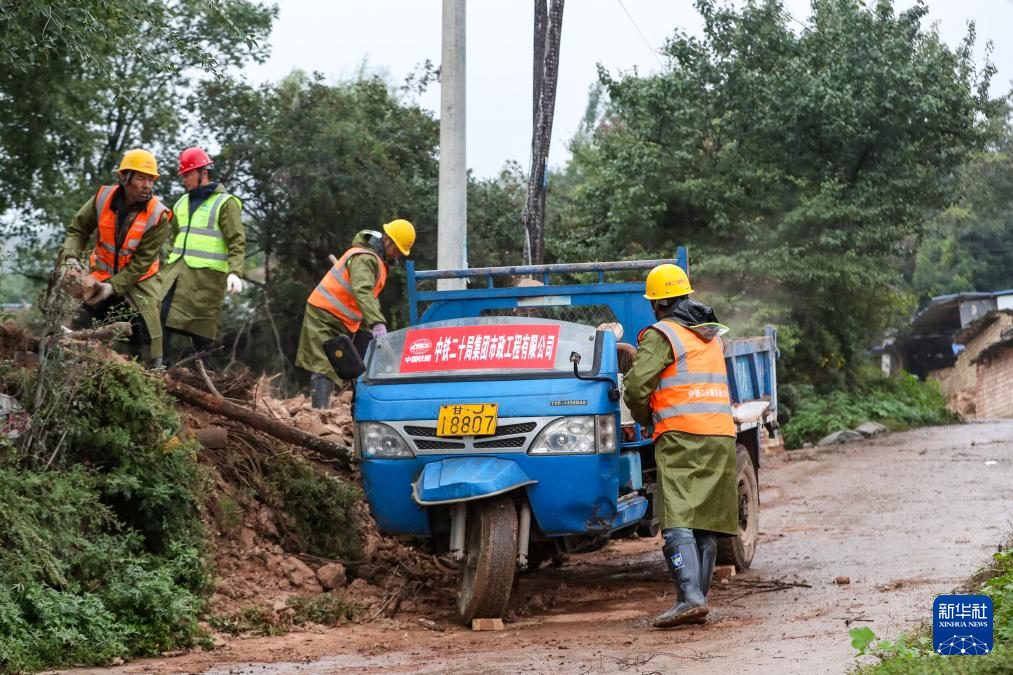 9月28日,在定西市漳县武阳镇汪家河村卢家屲社,中铁二十局集团市政工程有限公司抢险人员在进行清堵排险作业。新华社记者 郎兵兵 摄