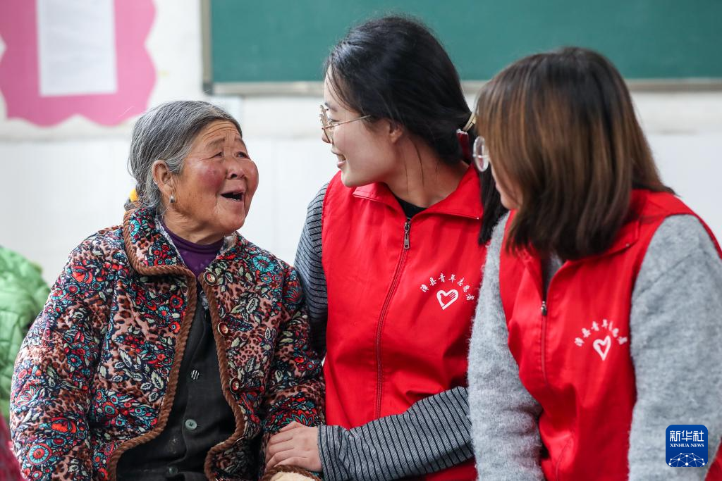 9月28日,在定西市漳县木林小学安置点宿舍内,志愿者与受灾群众交流。新华社记者 郎兵兵 摄