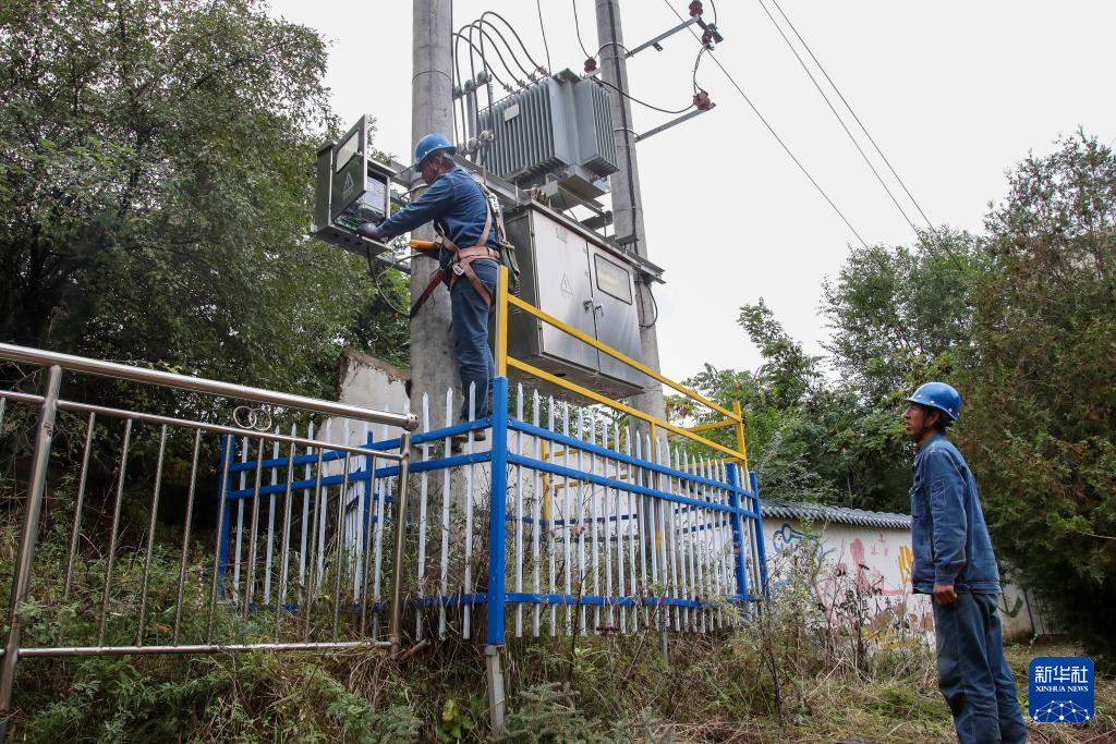 9月28日,在定西市漳县木林小学安置点,电力人员对供电设施进行检查。新华社记者 郎兵兵 摄
