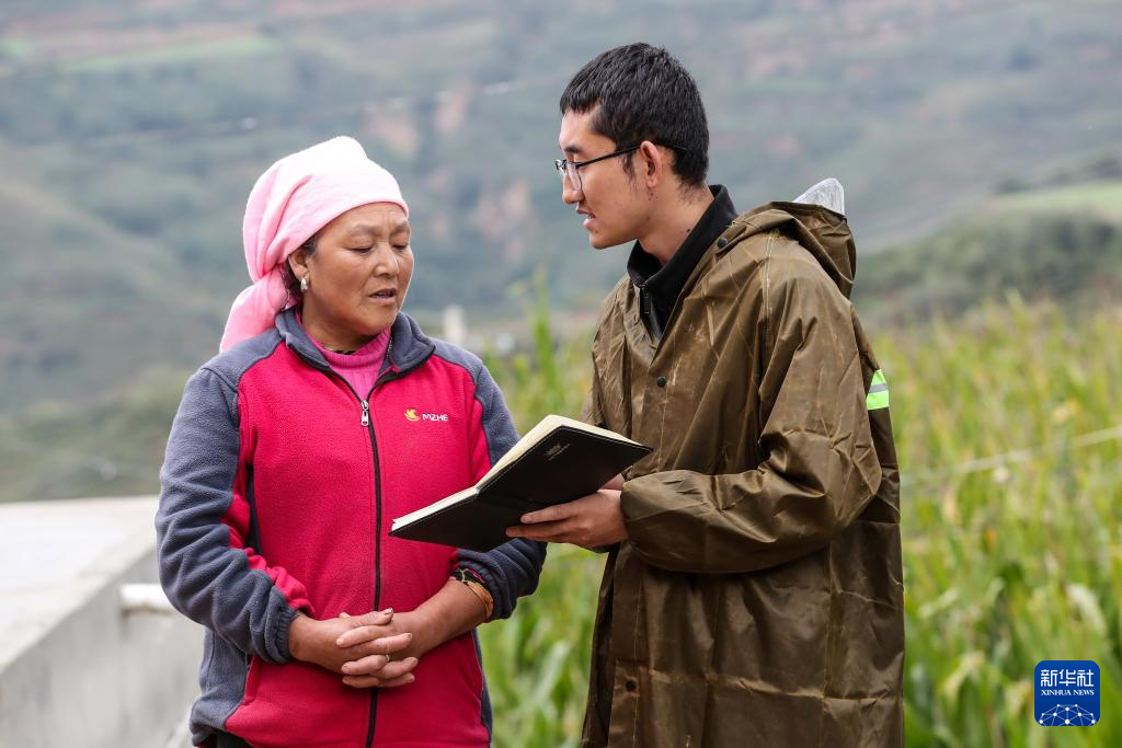 9月28日,在定西市漳县武阳镇汪家河村卢家屲社,乡镇干部登记转移安置人员信息。新华社记者 郎兵兵 摄