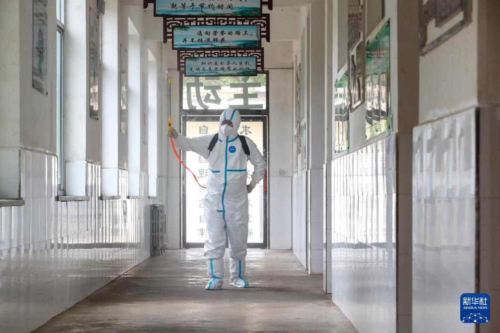 9月28日,在定西市漳县木林小学安置点,工作人员在进行环境消杀作业。新华社记者 郎兵兵 摄