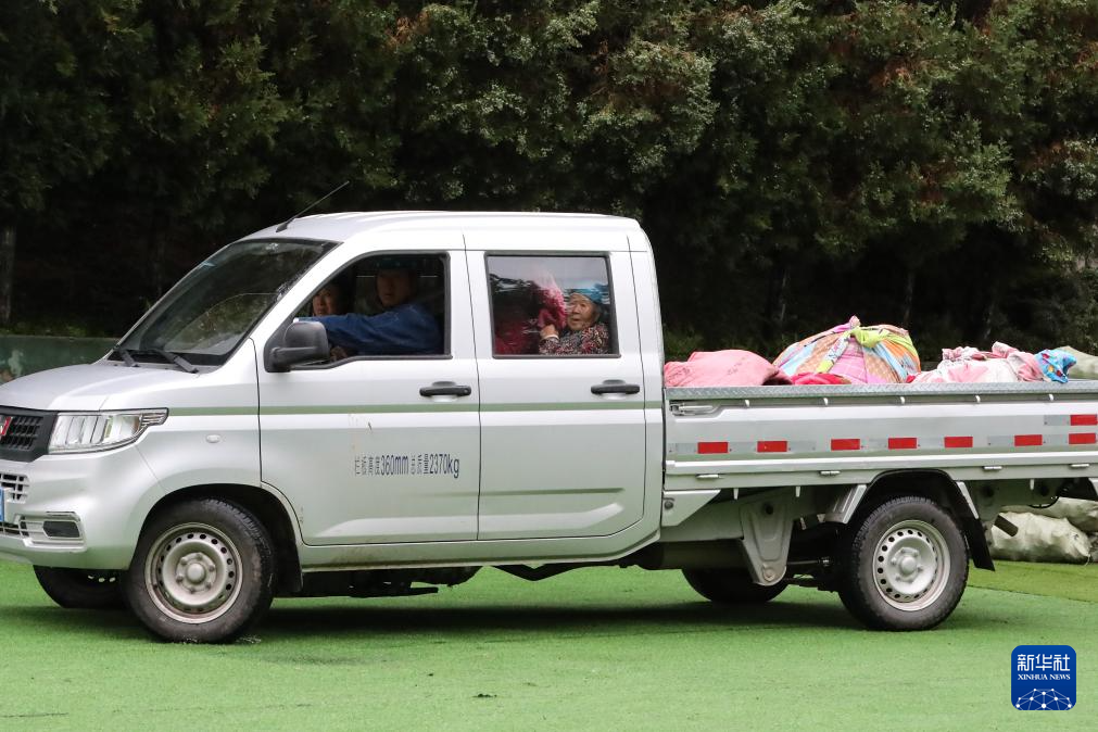 9月28日,在定西市漳县木林小学安置点,一辆转移受灾群众的车辆驶入操场。新华社记者 郎兵兵 摄
